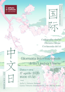 In occasione della Giornata Mondiale della Lingua Cinese, l’Istituto Confucio di Roma è lieto di invitarVi all’evento culturale “Cinese: accendere sogni colorati” che si svolgerà il 17 aprile 2026 dalle ore 16 alle ore 17:30 presso l’Aula 5 di Palazzo Baleani (Corso Vittorio Emanuele II 244). Durante l’evento si svolgeranno dimostrazioni della cerimonia del tè, di pittura e calligrafia cinese.